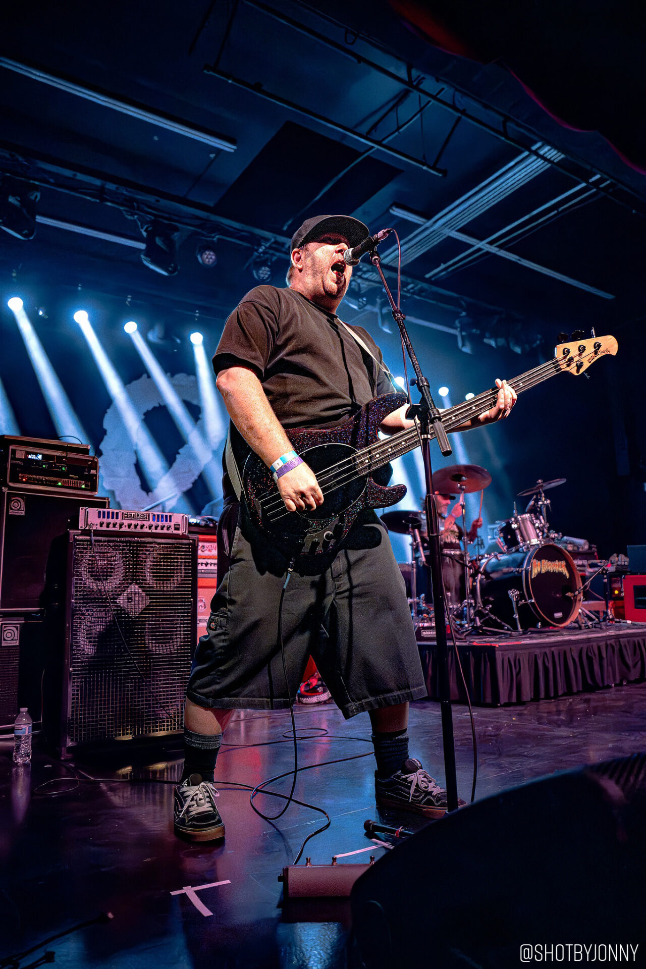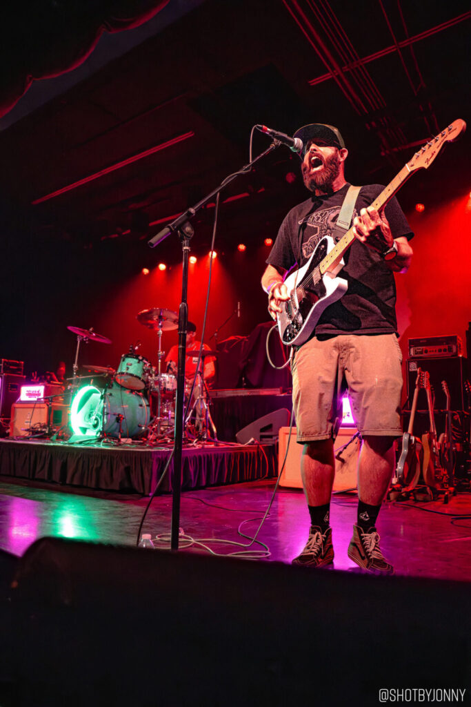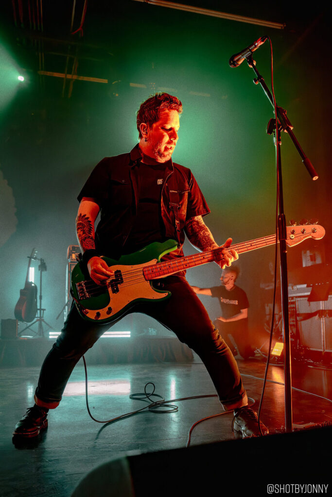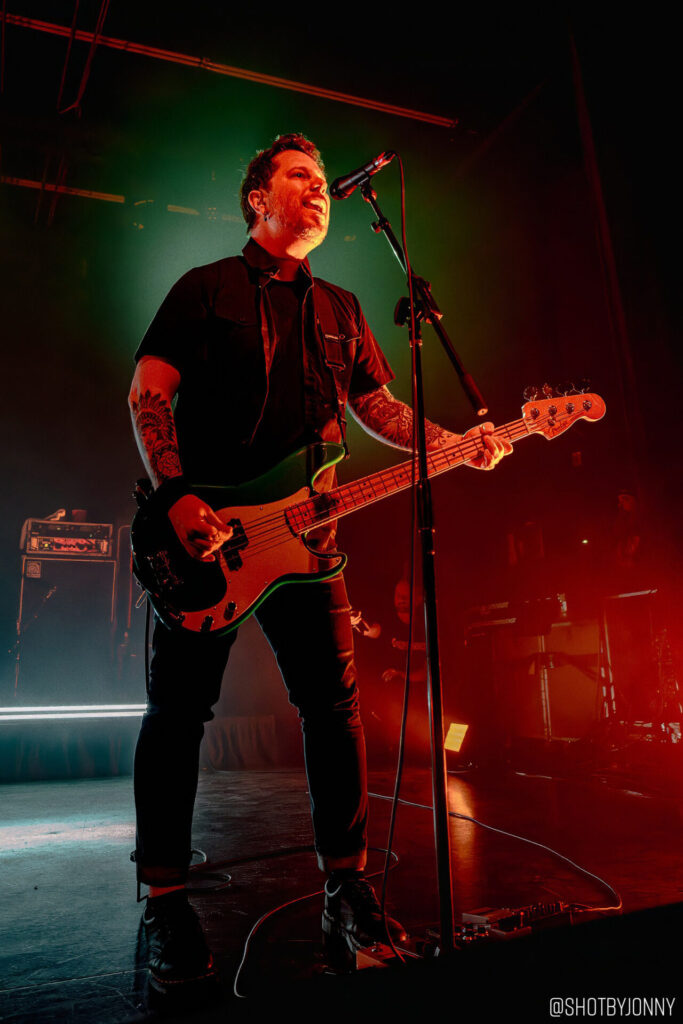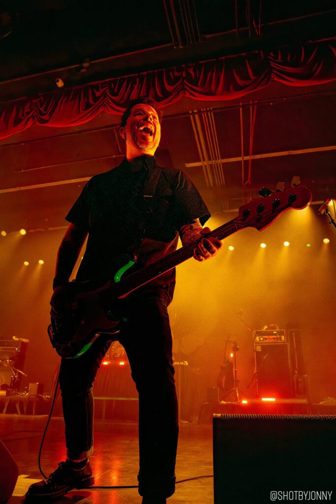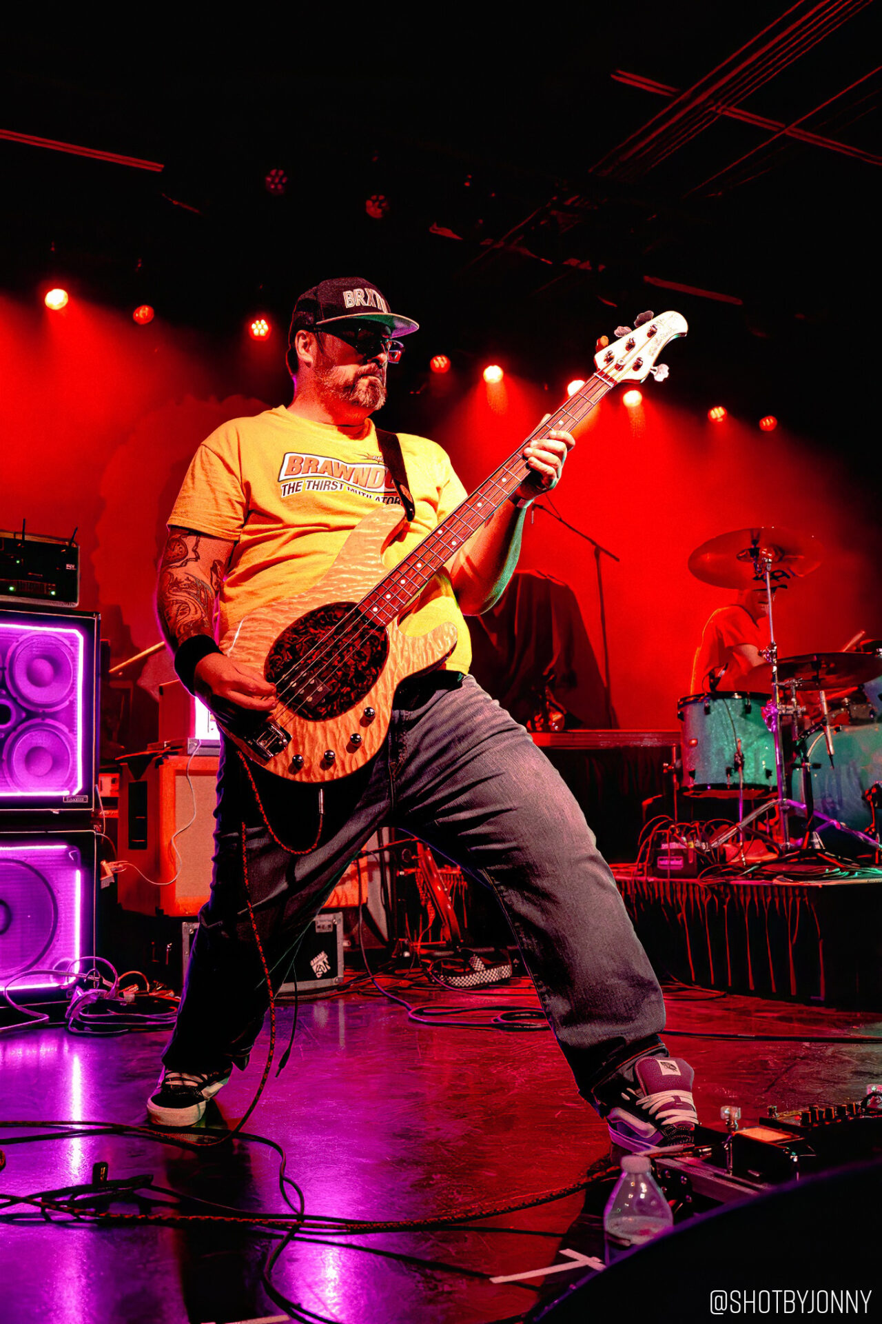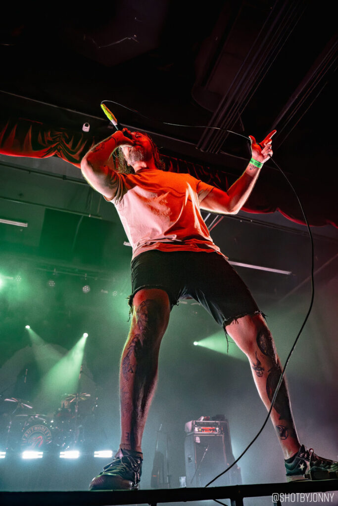 Jason DeVore moved constantly, refusing to hold a fixed position long enough for the stage to settle. His movement drove the set forward, keeping the energy active instead of anchored. At several points, he pulled back toward drummer Chris Dalley before pushing forward again. Those moments broke the forward momentum just enough to reset the energy without interrupting it.