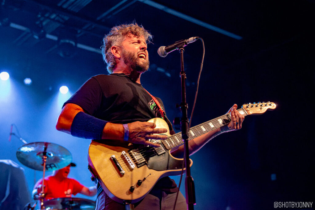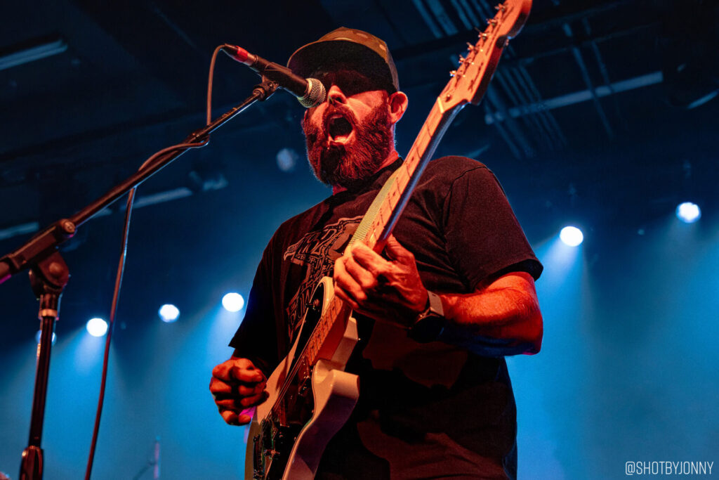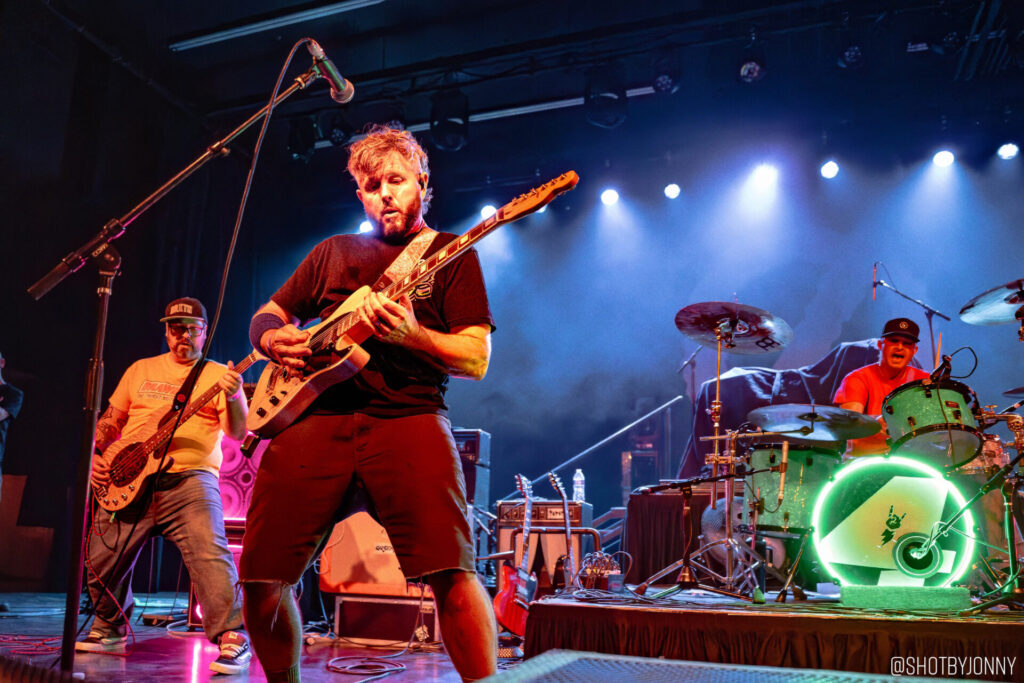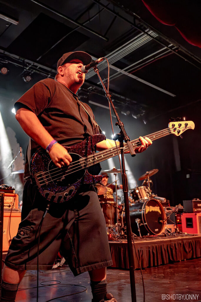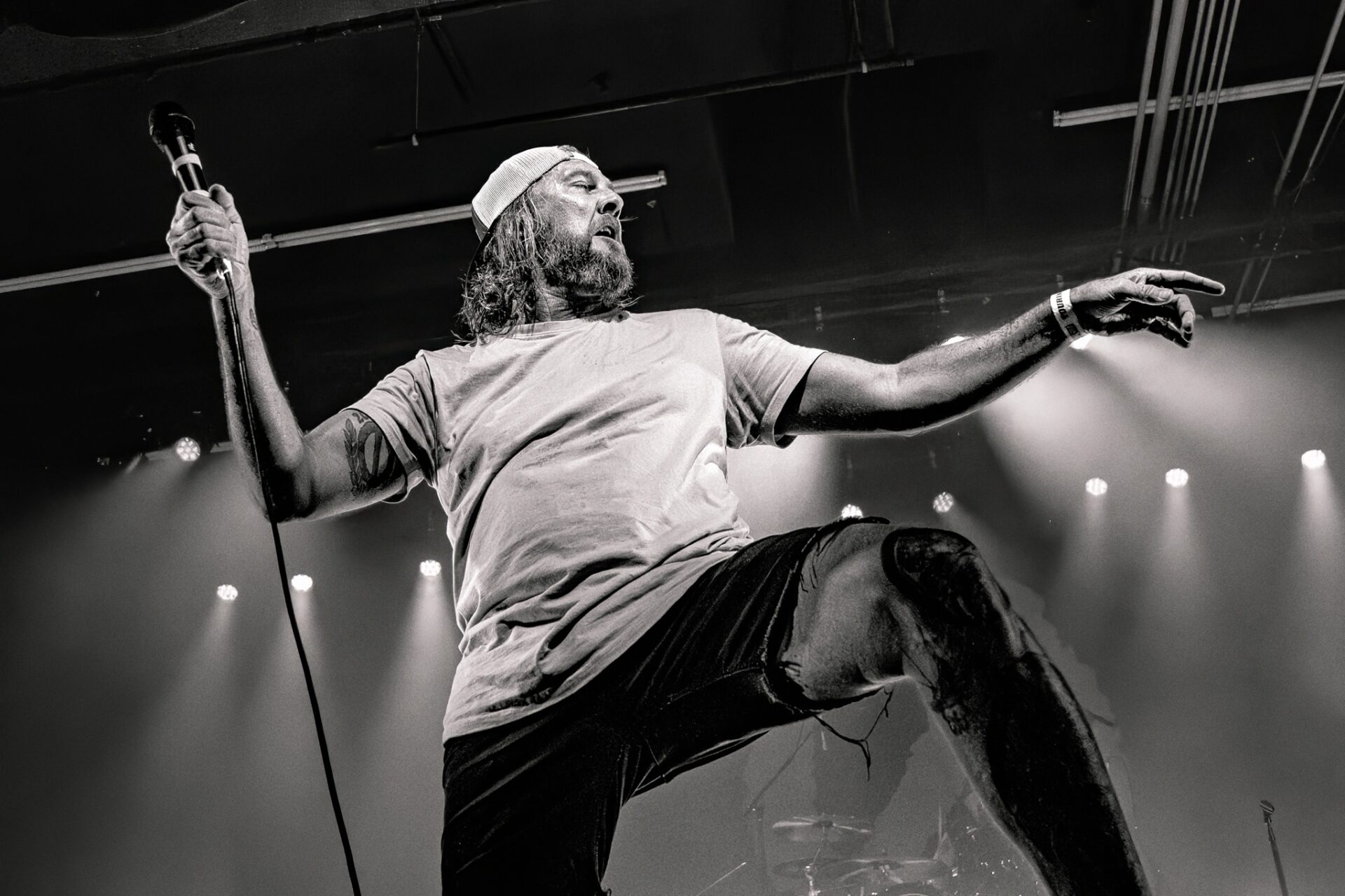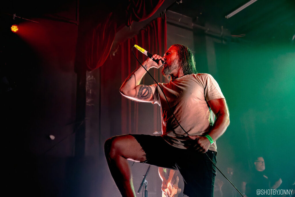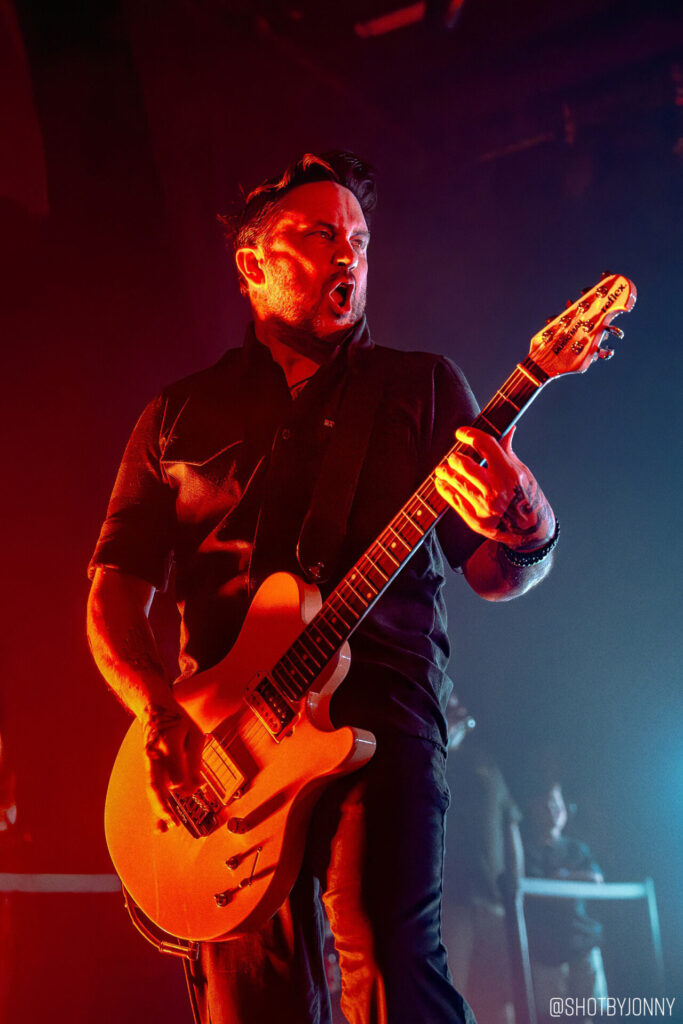 Jason DeVore moved constantly, refusing to hold a fixed position long enough for the stage to settle. His movement drove the set forward, keeping the energy active instead of anchored. At several points, he pulled back toward drummer Chris Dalley before pushing forward again. Those moments broke the forward momentum just enough to reset the energy without interrupting it.