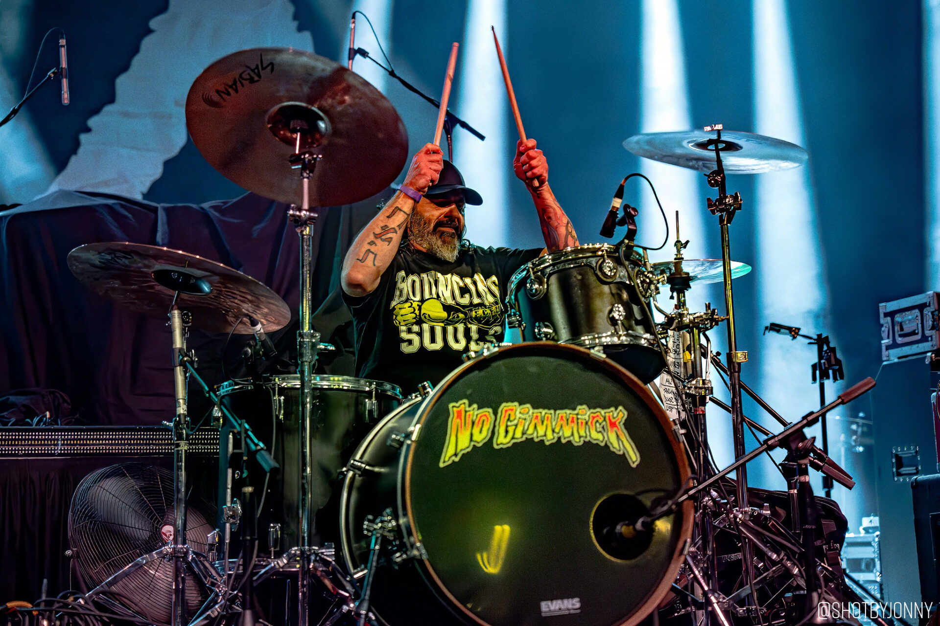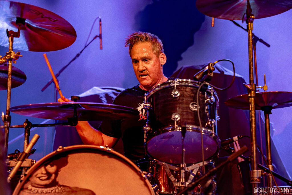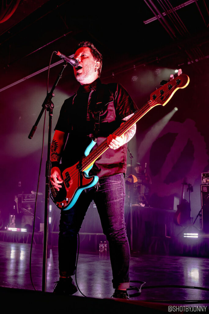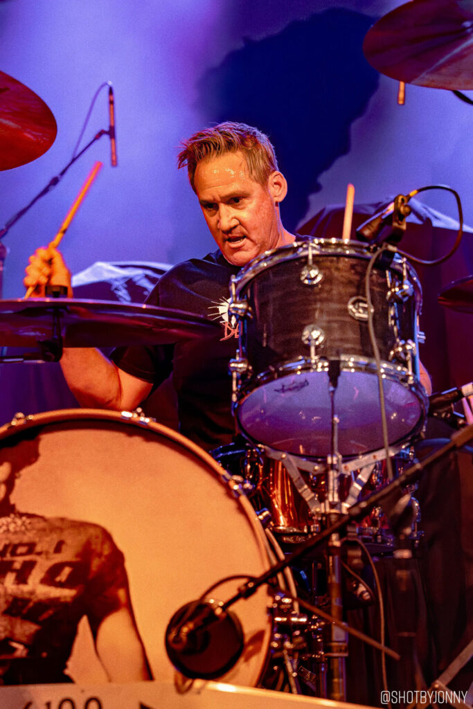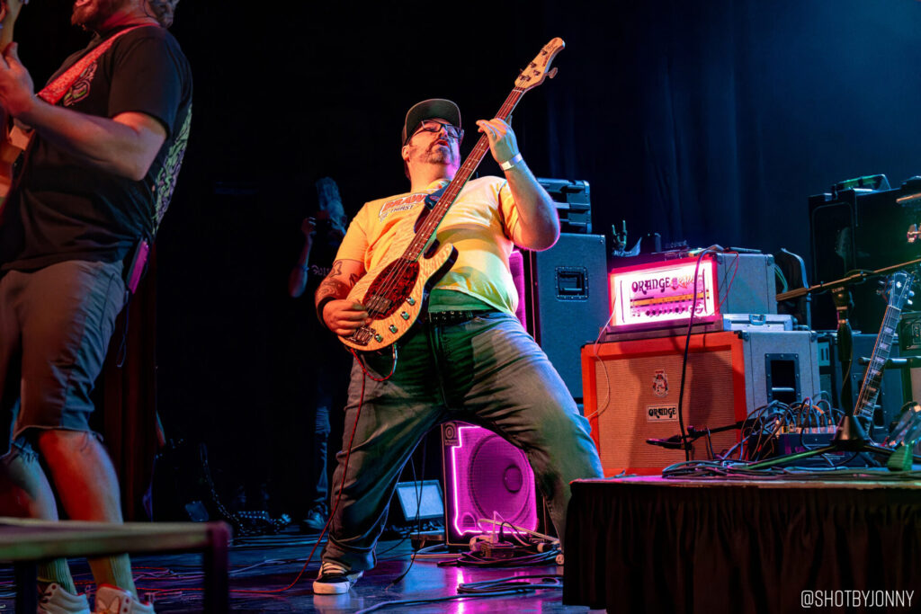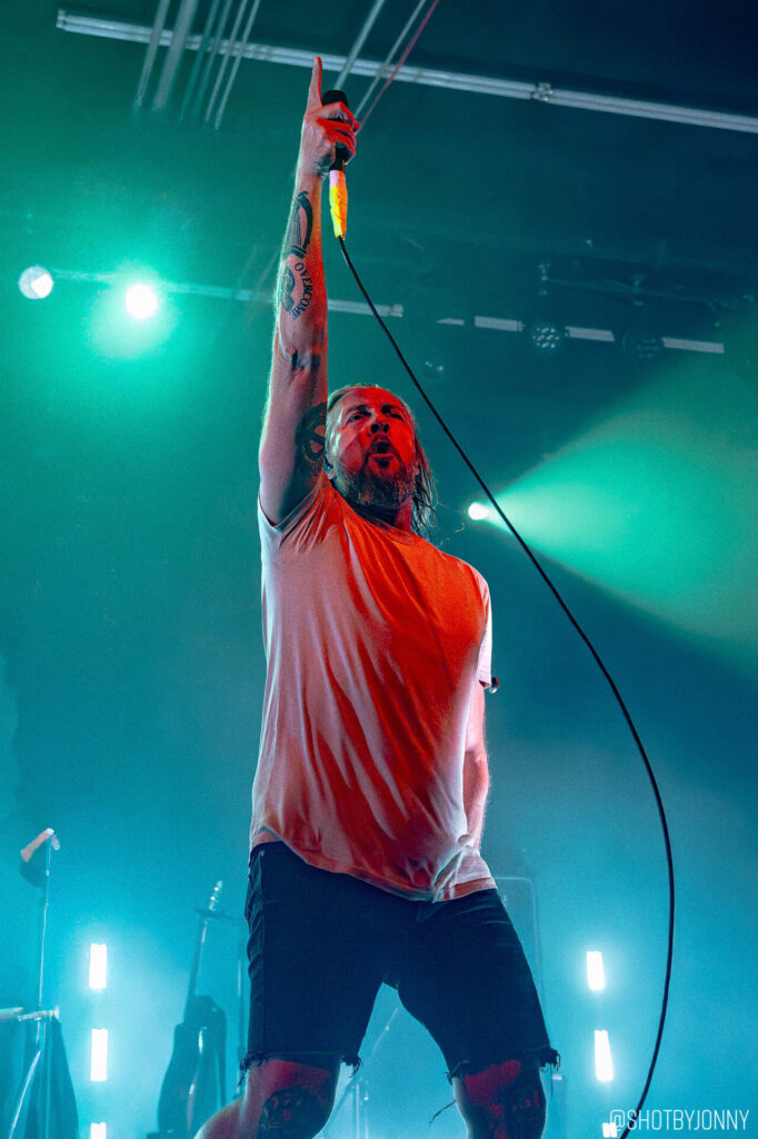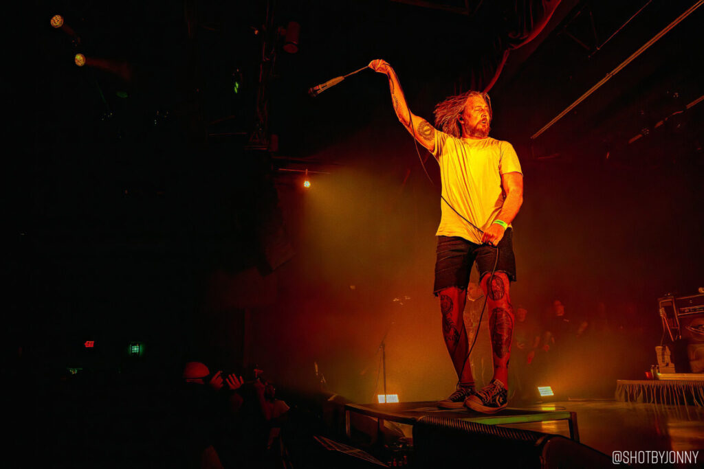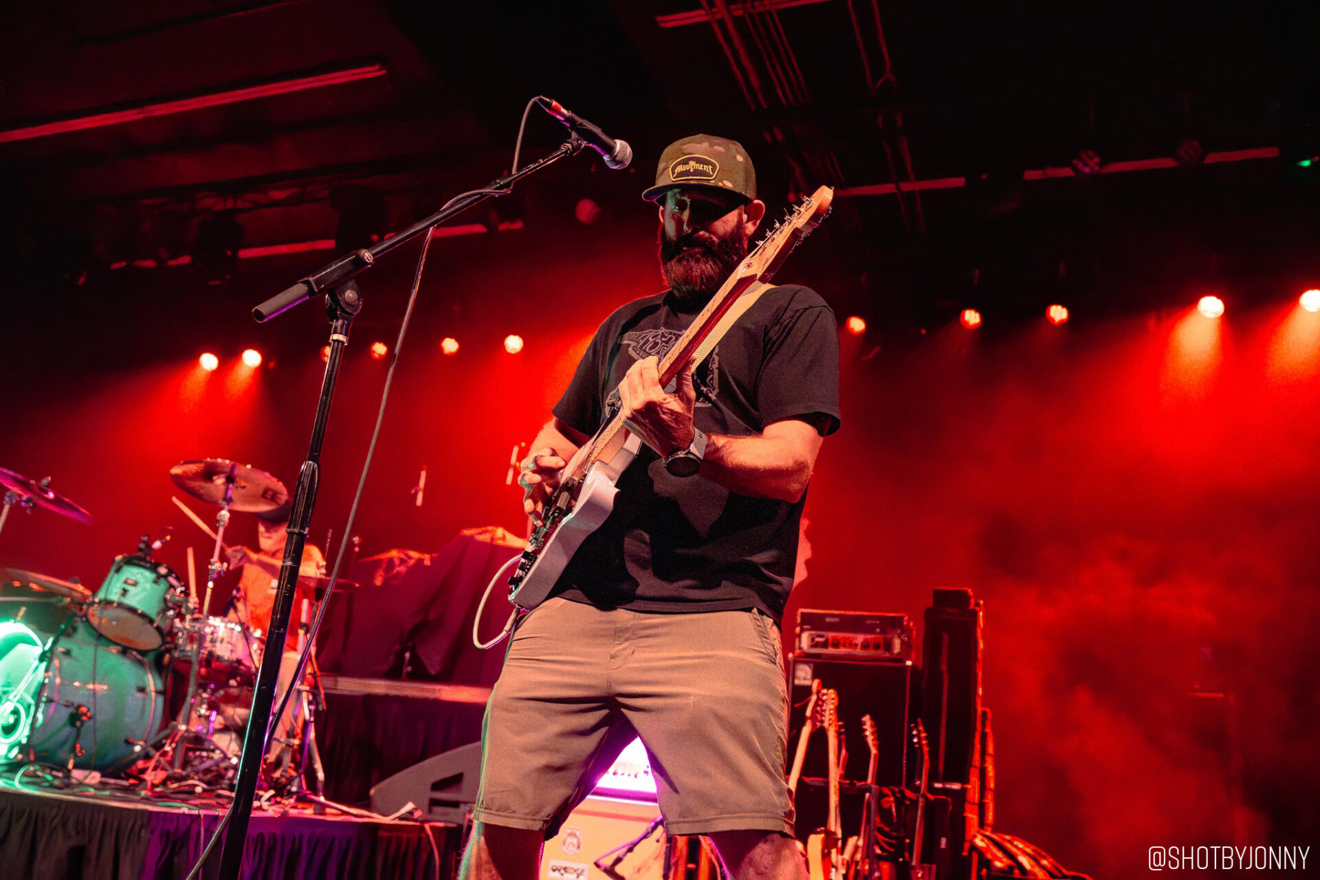 Jason DeVore moved constantly, refusing to hold a fixed position long enough for the stage to settle. His movement drove the set forward, keeping the energy active instead of anchored. At several points, he pulled back toward drummer Chris Dalley before pushing forward again. Those moments broke the forward momentum just enough to reset the energy without interrupting it.