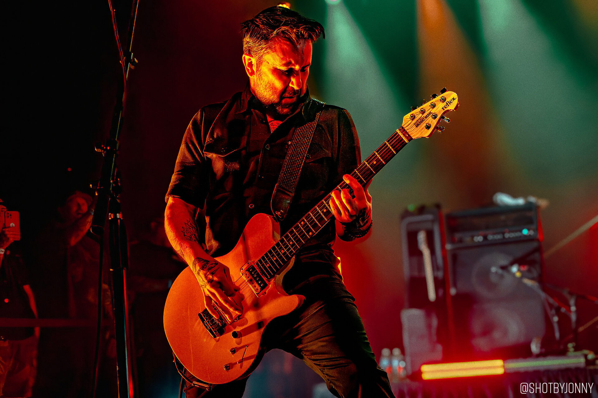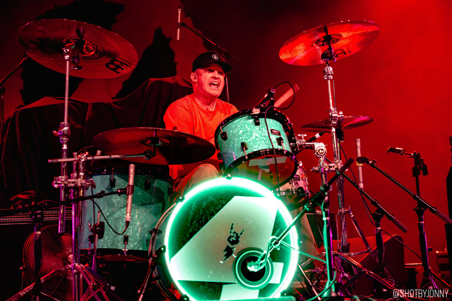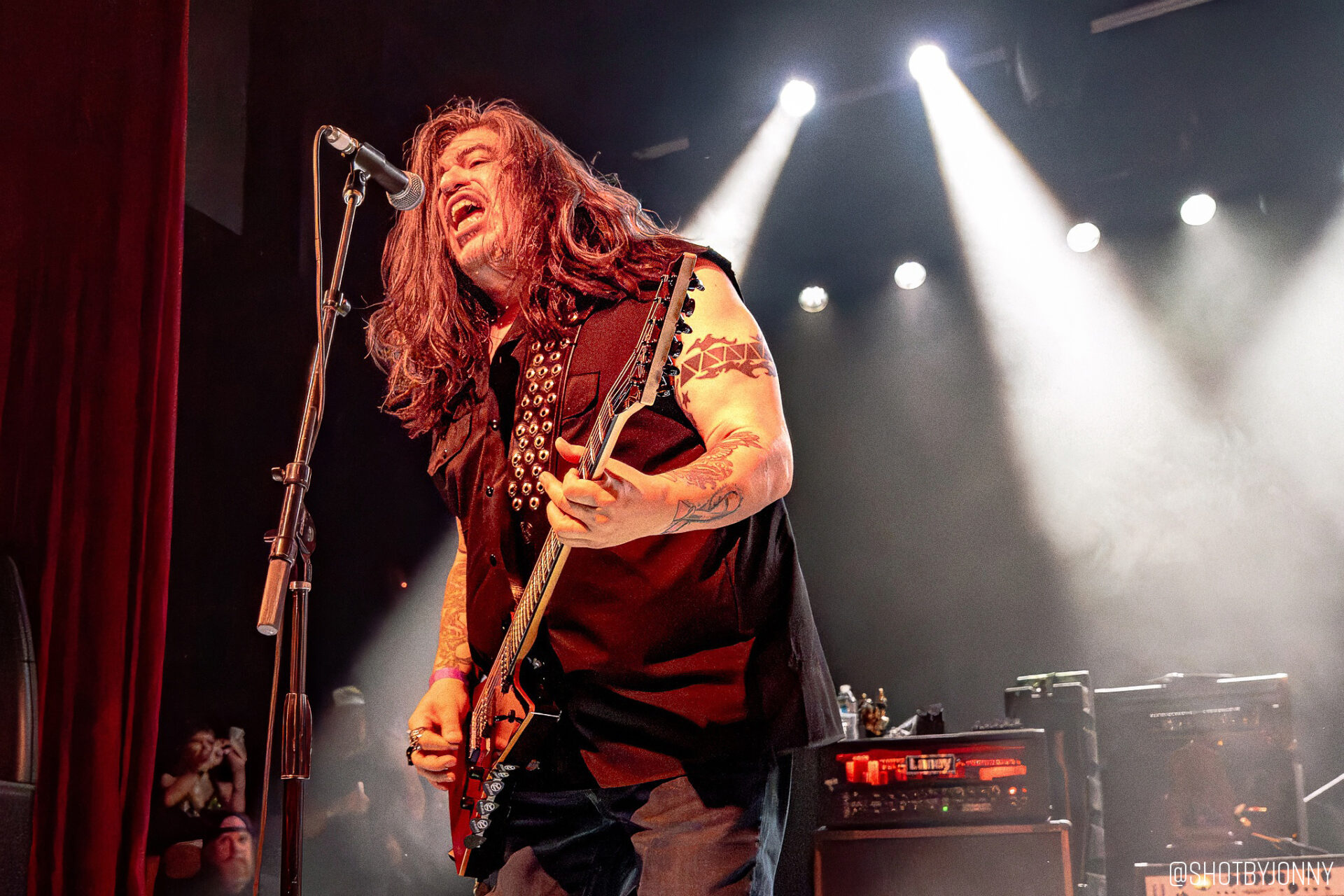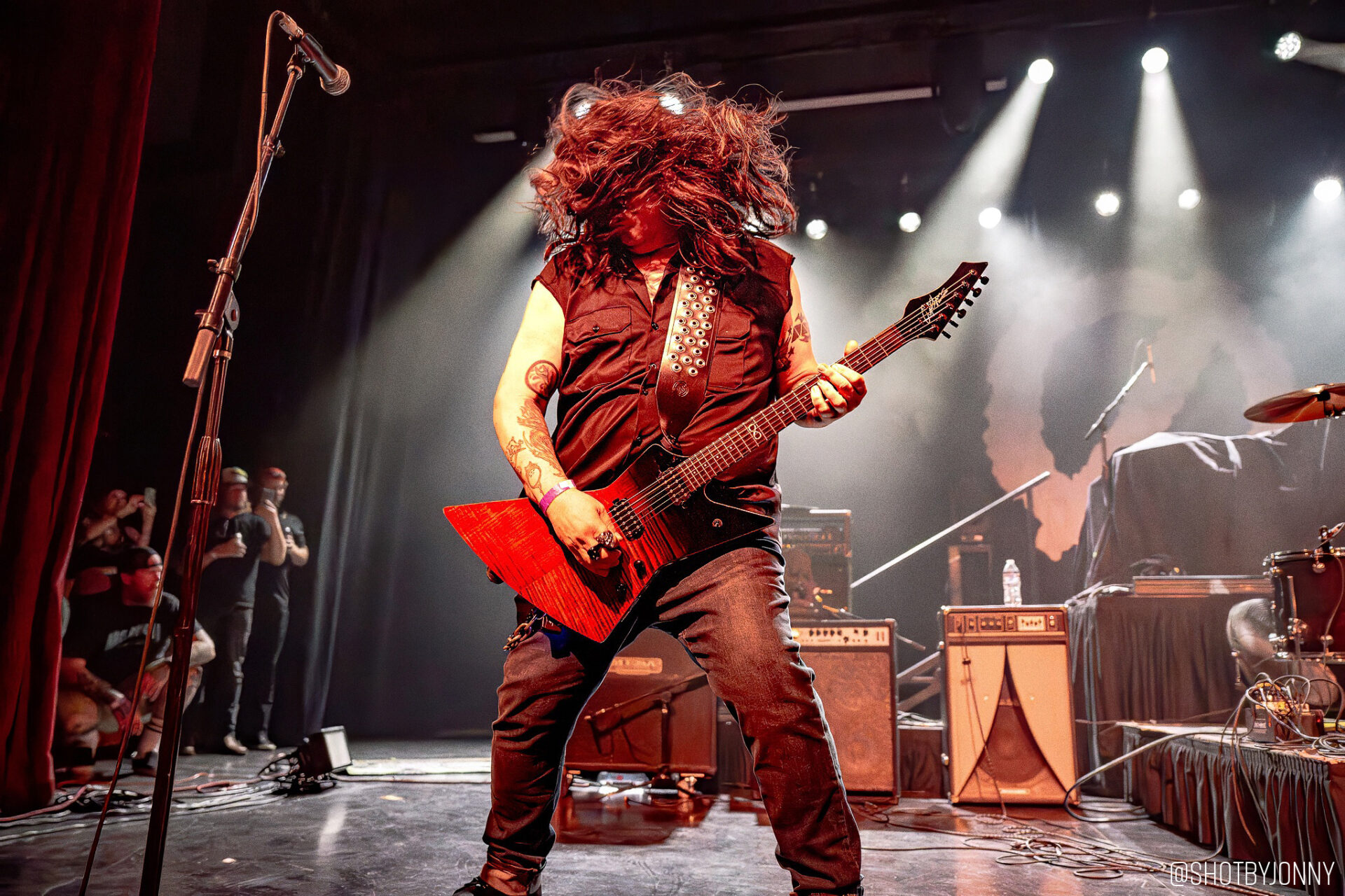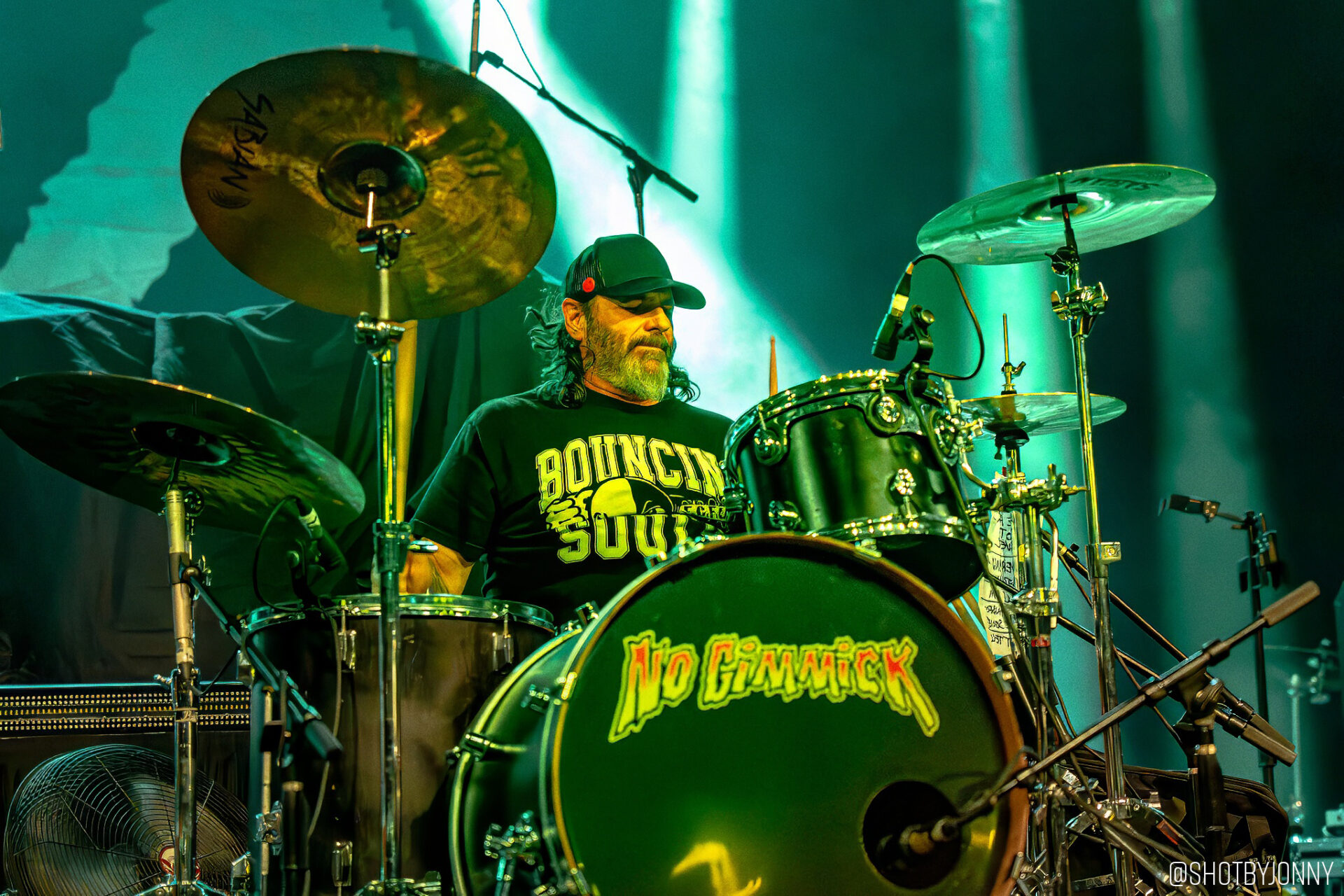 Jason DeVore moved constantly, refusing to hold a fixed position long enough for the stage to settle. His movement drove the set forward, keeping the energy active instead of anchored. At several points, he pulled back toward drummer Chris Dalley before pushing forward again. Those moments broke the forward momentum just enough to reset the energy without interrupting it.