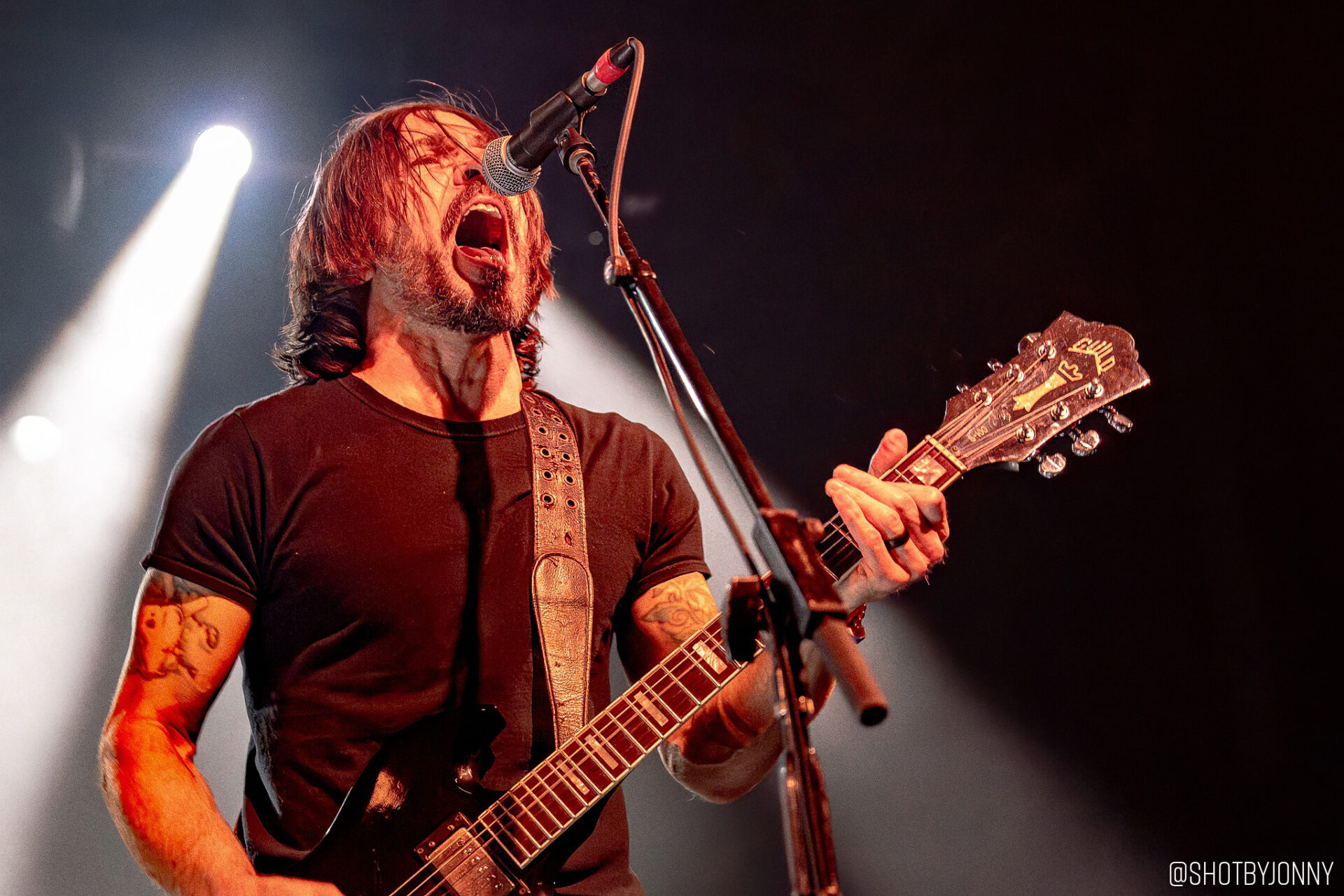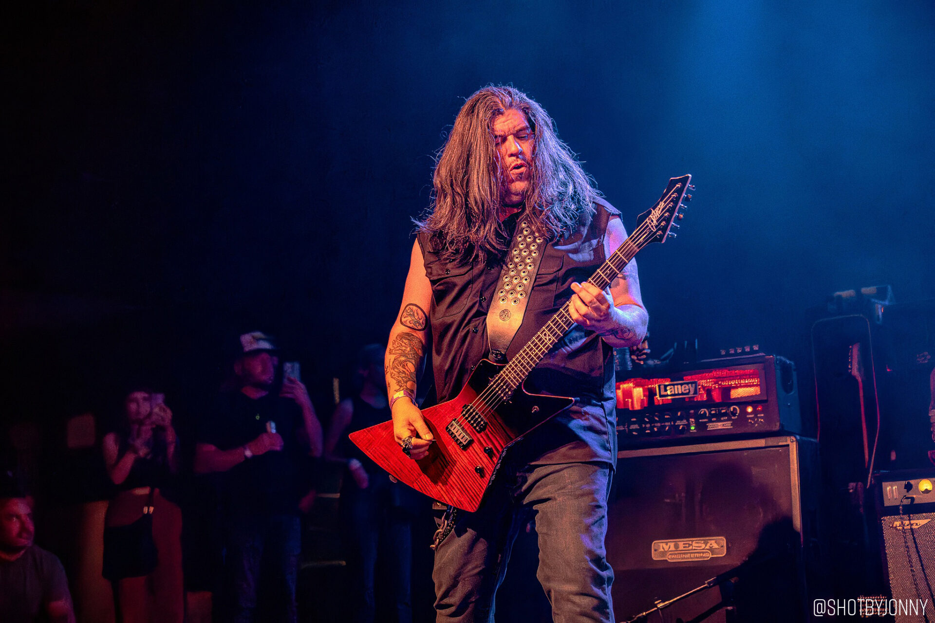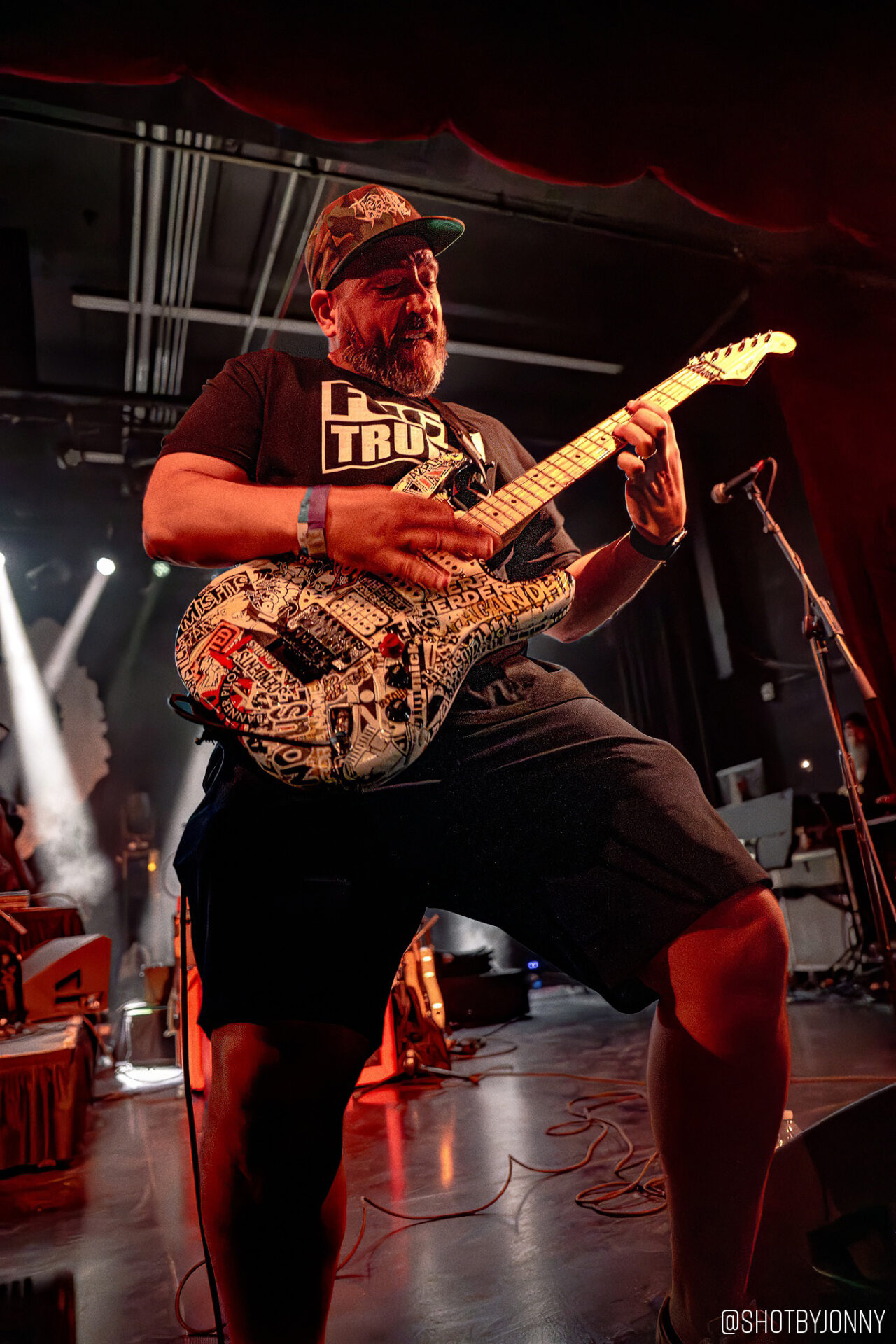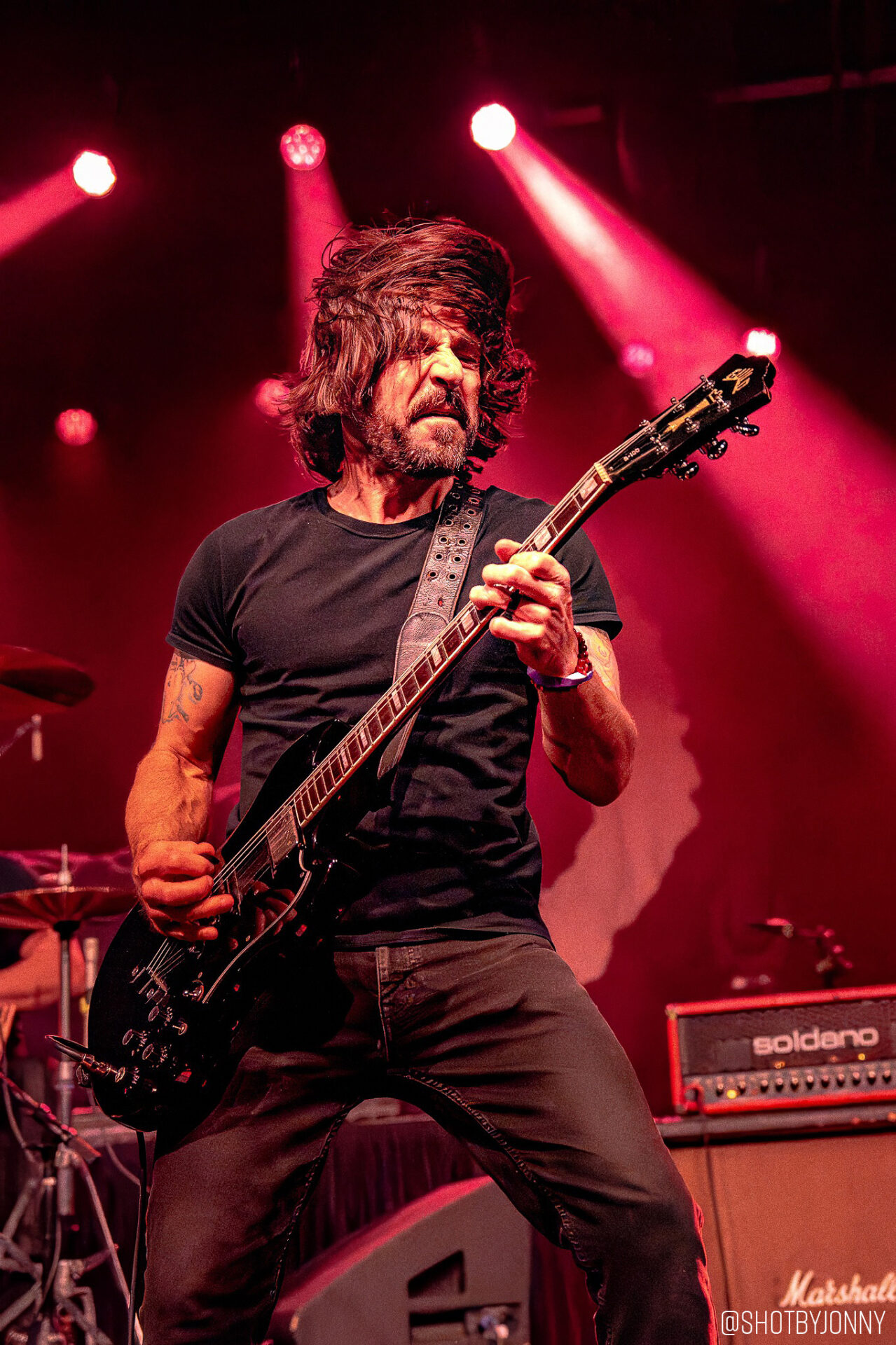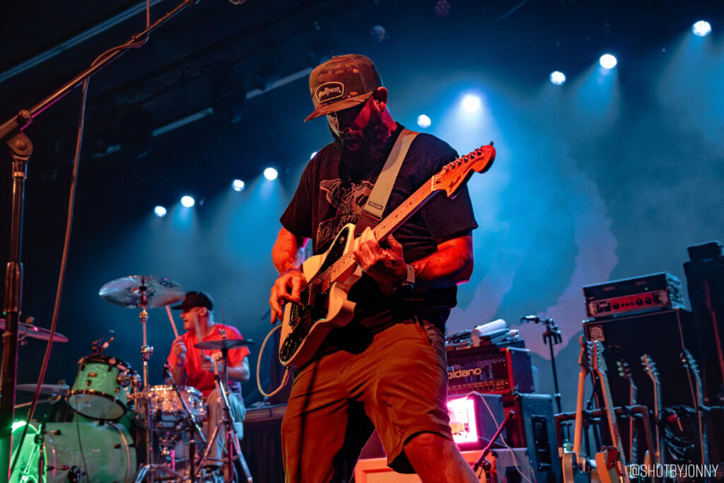 Jason DeVore moved constantly, refusing to hold a fixed position long enough for the stage to settle. His movement drove the set forward, keeping the energy active instead of anchored. At several points, he pulled back toward drummer Chris Dalley before pushing forward again. Those moments broke the forward momentum just enough to reset the energy without interrupting it.