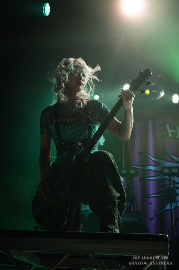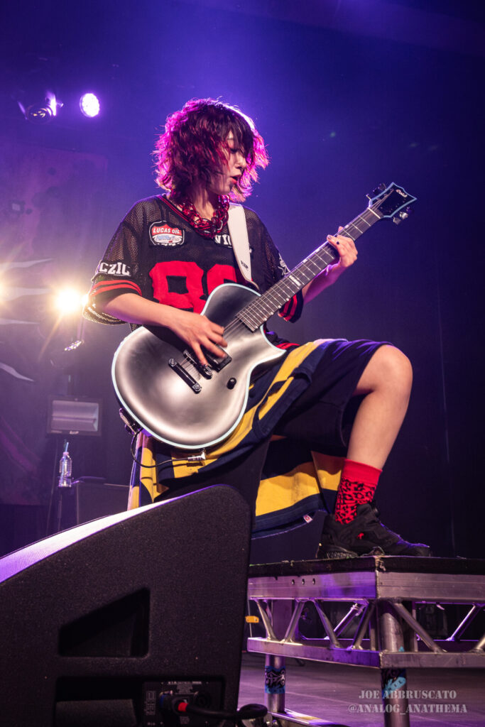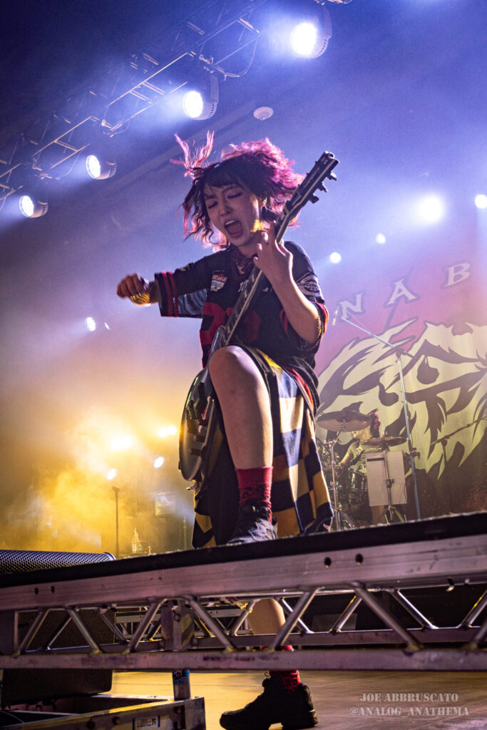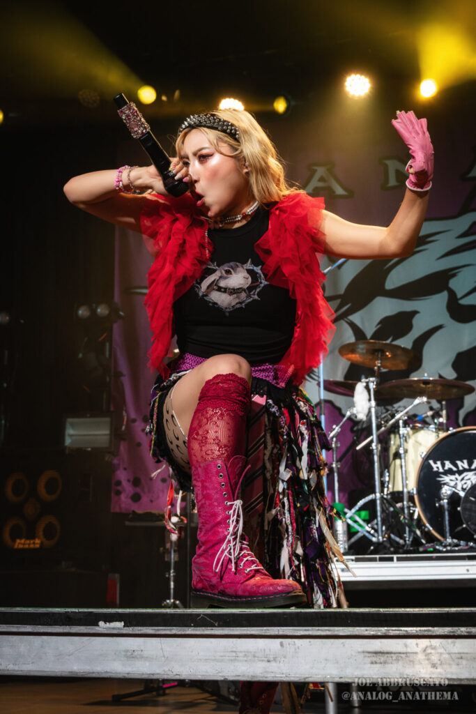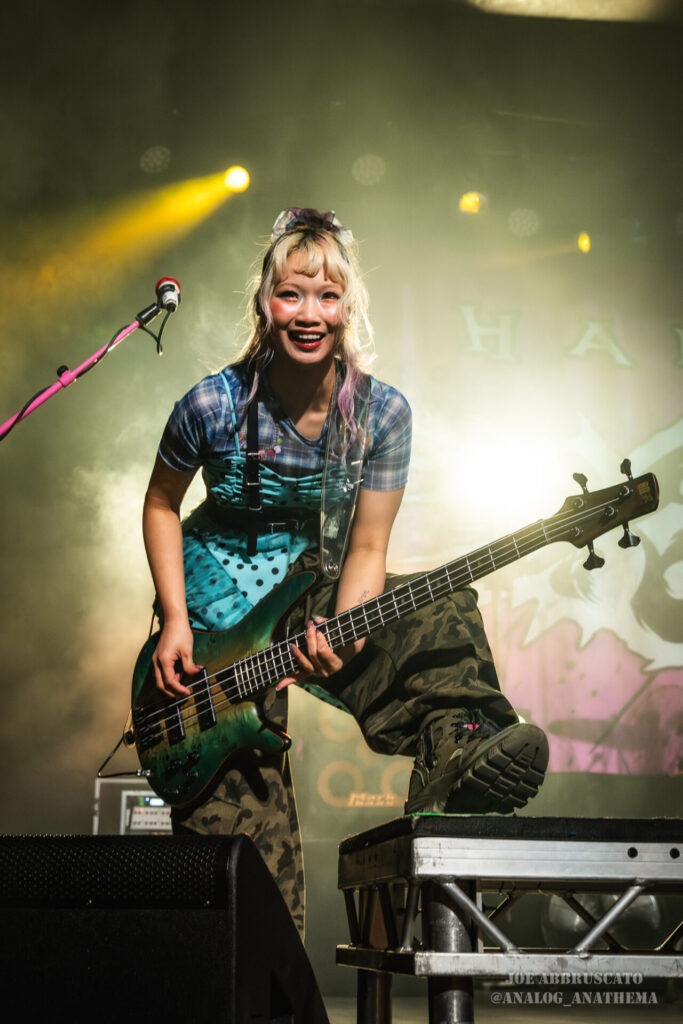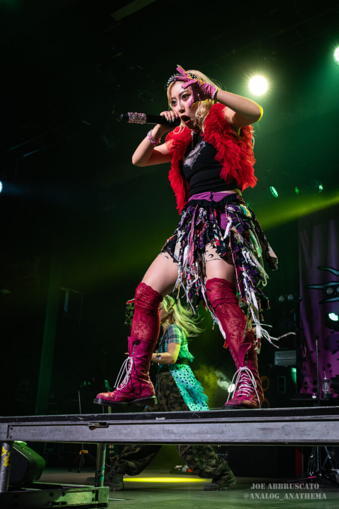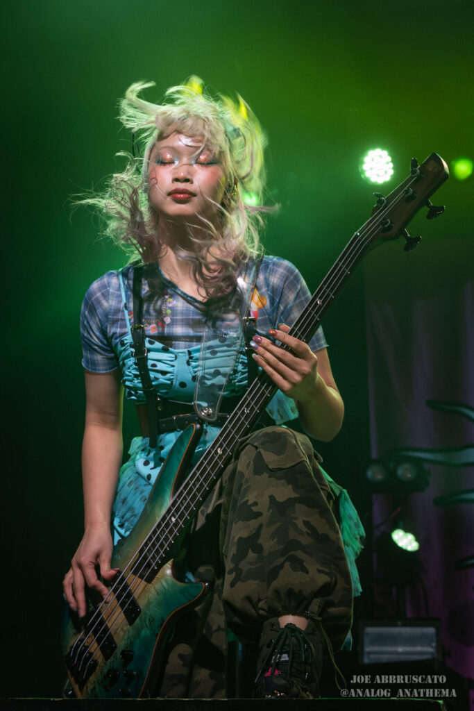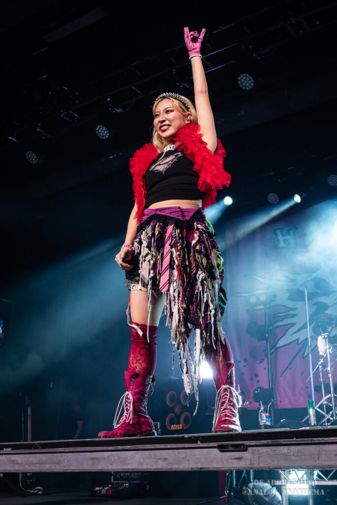 What made the performance stand out wasn’t just the novelty of the genre fusion, but how tight and intentional it all felt. HaNaBie. kicked things off with “NEET GAME,” landing it with punishing force that served as a mere appetizer for the set list to follow. “TOUSOU” and “O•TA•KU Lovely Densetsu” injected a chaotic, almost comedic energy into the set with Yukina, Matsuri, and Hettsu jumping and bouncing around stage while also shifting into bonechilling guitar riffs and screams. Underlying the playfulness of their look, the band’s musicianship was razor sharp. Every breakdown hit with mechanical precision, every tempo shift locked in perfectly. Nothing felt sterile or preplanned; instead, there was a palpable sense of joy in it all, a willingness to embrace contradiction: cute versus crushing, polished versus feral. That duality is the band’s identity, and in Phoenix, it resonated deeply with a crowd that clearly understood the assignment.