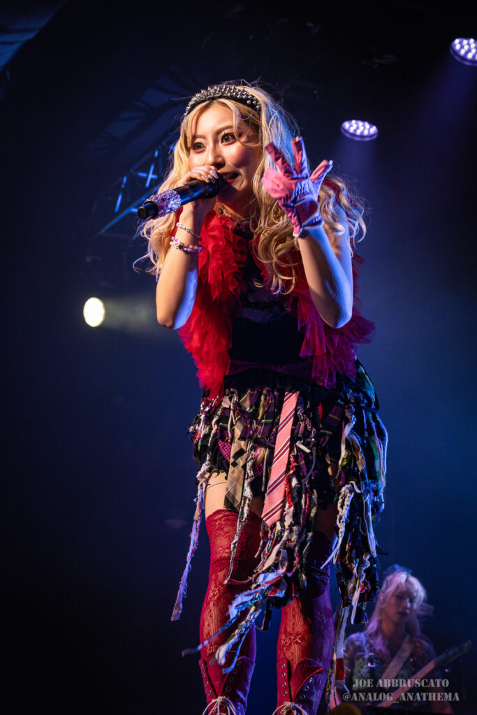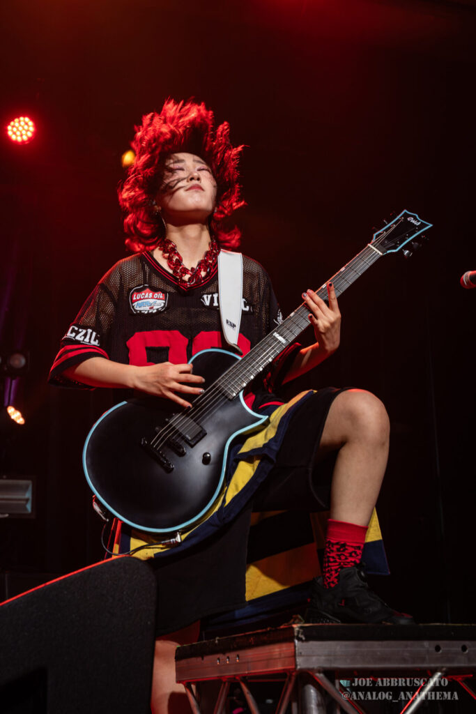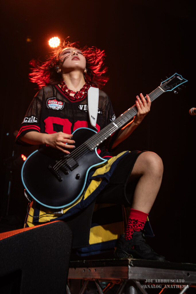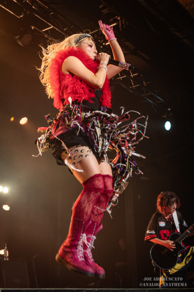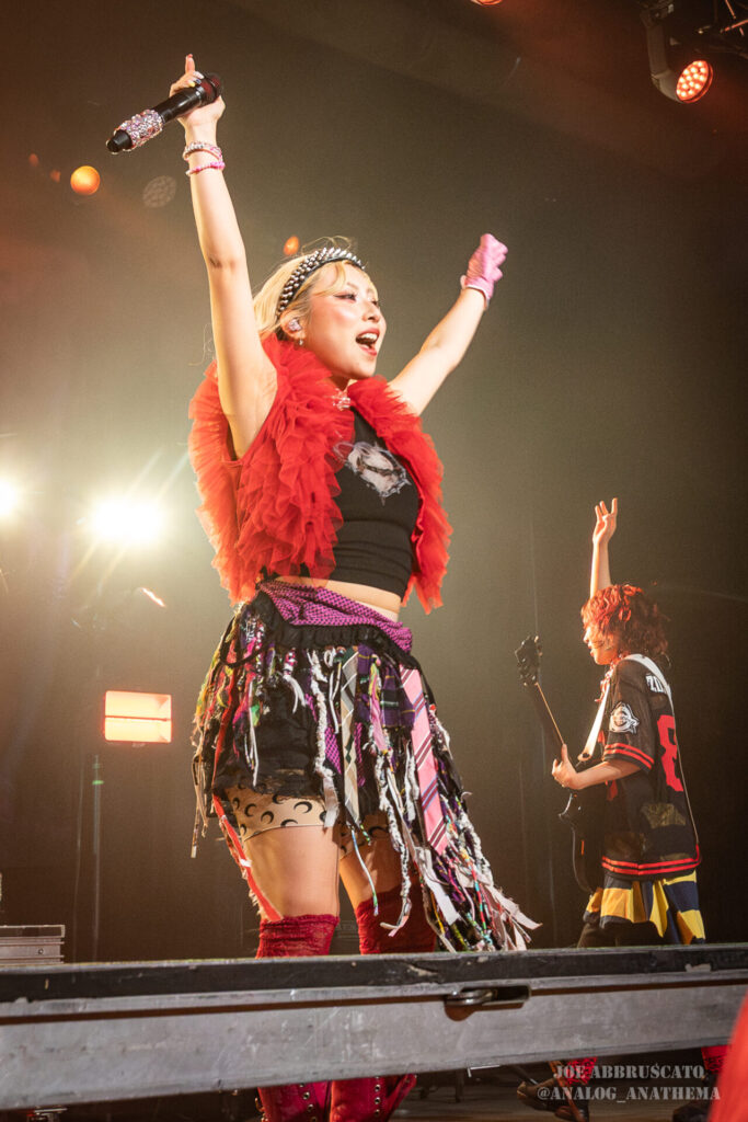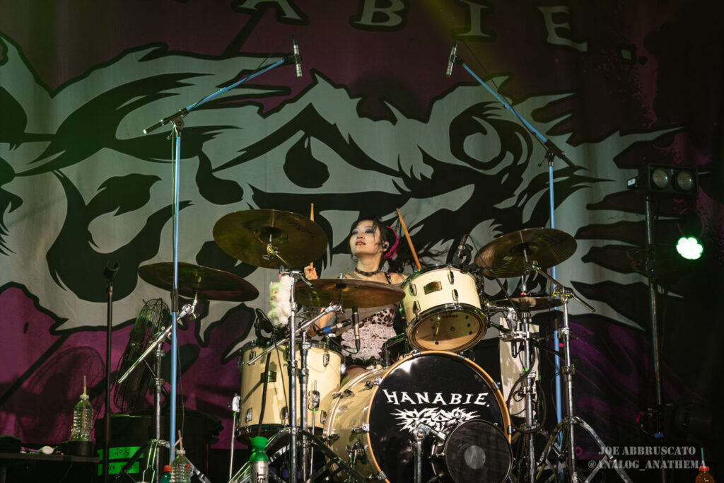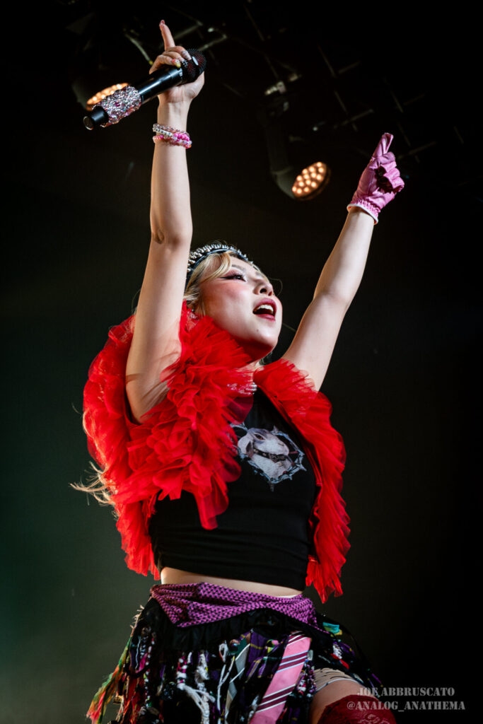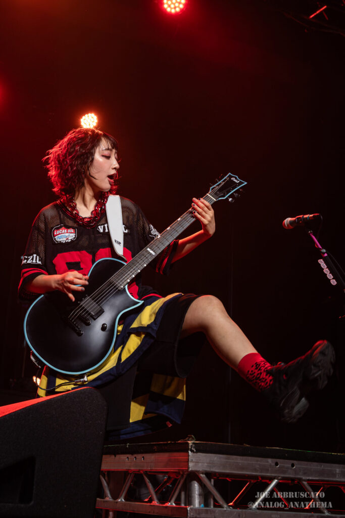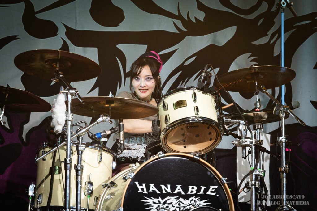 What made the performance stand out wasn’t just the novelty of the genre fusion, but how tight and intentional it all felt. HaNaBie. kicked things off with “NEET GAME,” landing it with punishing force that served as a mere appetizer for the set list to follow. “TOUSOU” and “O•TA•KU Lovely Densetsu” injected a chaotic, almost comedic energy into the set with Yukina, Matsuri, and Hettsu jumping and bouncing around stage while also shifting into bonechilling guitar riffs and screams. Underlying the playfulness of their look, the band’s musicianship was razor sharp. Every breakdown hit with mechanical precision, every tempo shift locked in perfectly. Nothing felt sterile or preplanned; instead, there was a palpable sense of joy in it all, a willingness to embrace contradiction: cute versus crushing, polished versus feral. That duality is the band’s identity, and in Phoenix, it resonated deeply with a crowd that clearly understood the assignment.